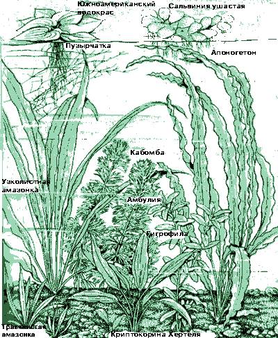 1. Эйхорния, водный гиацинт 2. Анубиасы: а — афцели б — конголезский в — бартери