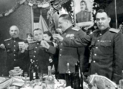 Торжественный вечер, посвященный победе над Германией. На снимке (слева направо): В. Г. Клементьев, А. И. Гастилович, Н. С. Иванов, Л. И. Брежнев. 20 мая 1945 г.
