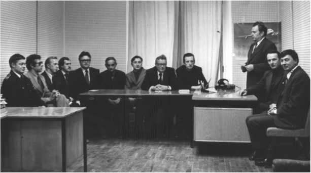 140. Встреча с Г. Гречко после второго космического полета. В кабинете ректора присутствуют слева направо: Н.Ф. Уткин, В.В. Чернигин, Г.А. Лукьянов, Е.В. Кульков, Г.М. Гречко, Б.Ф. Щербаков, В. ТоныиА. ев, А.А. Анциферов.