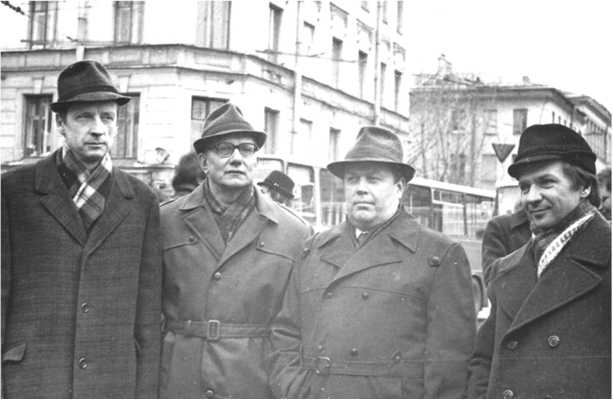 154. БГТУ «Военмех» им. Д.Ф. Устинова. Встреча выпускников. Слева направо: В.Л. Клейман, Л.А. Швалюк, В.А. Филъков (вып. 1970 г.) ?.?. Зилъбербург (вып. 1973 г.), Б.Ф. Щербаков.