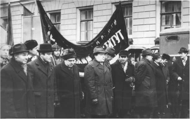 103. Сбор на праздничную демонстрацию. Слева Л.И. Смирнов, справа Б.Ф. Щербаков.