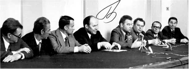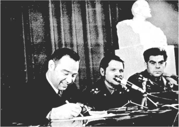 109. Г.М. Гречко на пресс-конференции в Звездном городке. У микрофона А. Губарев и Г. Береговой.