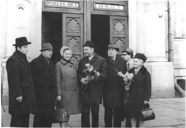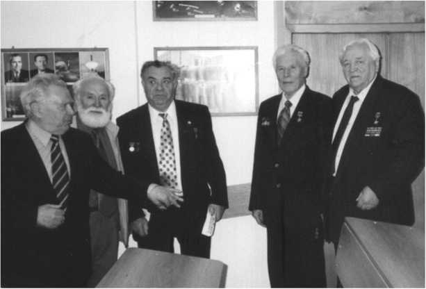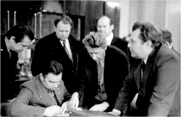 141. Руководящий состав института: А.Я. Савенков, В.Е. Юстузов, Г.И. Агасиев, В.В. Шкварцов, Е.В. Кульков, Н.Ф. Уткин, Ю.Ф. Шипилин, И.П. Гинзбург, В.А. Кузнецов, Б.Ф. Щербаков, Ю.Д. Обогрелов, Г.А. Лукьянов приветствует Г.М. Гречко.