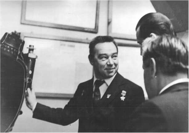 114. Г.М. Гречко рассказывает профессору В.В. Шкварцову об изучении ракетного двигателя.