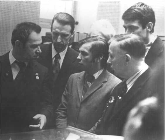 115. Г.М. Гречко в вычислительном центре института. Его сопровождают В.В. Шкварцов, Б.П. Усольцев, А.Т. Носов.