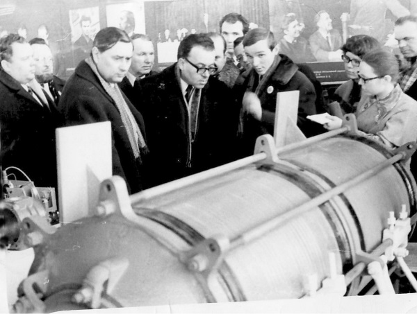 120. На городской выставке студенческого творчества Б.Ф. Щербаков, Е.М. Виноградов, секретарь обкома КПСС Б.С. Андреев, А.Т. Носов, первый секретарь горкома КПСС Б.И. Аристов, студенты Военмеха.