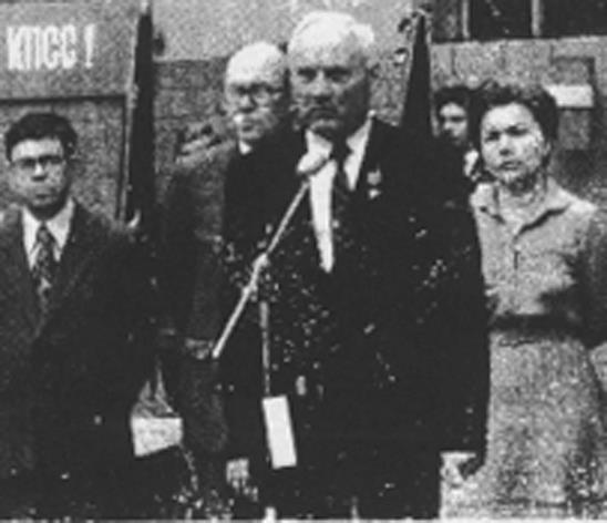 122. Е.Г. Рудяк выступает на митинге по случаю годовщины снятия блокады Ленинграда. Стоят В.В. Чижов – главный редактор газеты, Е.В. Кульков – ректор института, Т.В. Захарова – секретарь райкома КПСС.