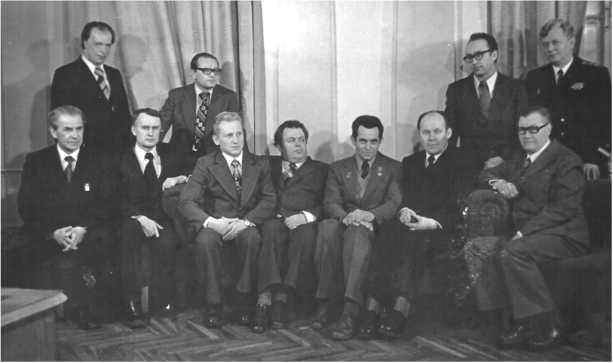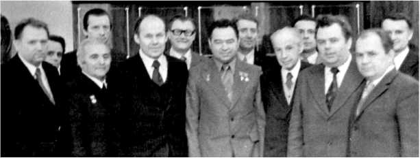 150. 17 апреля 1979 год. АМН. Сидят слева направо: В.В. Чернигин, Г.А. Лукьянов, представитель космодрома Байконур, Б.Ф. Щербаков (секретарь парткома института), летчик-космонавт СССР А.С. Иванченко, Е.В. Кульков (ректор института), ?.Ф. Уткин; стоят: Ю.И.Филимонов, В.М. Тонышев, О.Я. Романов, И.К. Кора.