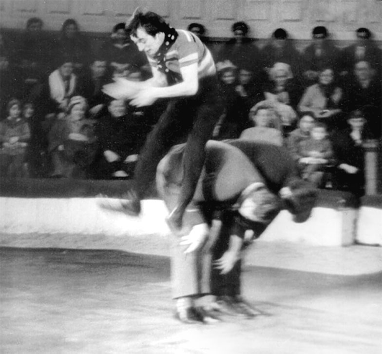 Причесали нас на один манер – челки на лоб, так что узнать издали невозможно. Первым «козлом» встал Авдюшко. Лёня перепрыгнул через него. Вторым – Кулик. Опять удачный прыжок, веселые ужимки, реплики в зал. Третьим встал настоящий униформист. Барабанная дробь – и удачный прыжок через всех. Наконец встаю я. Только все в одну сторону головой повернулись, а я в противоположную. Лёня по-хозяйски обходит своих «козлов». Заглядывает в лицо первого, второго, третьего… Пытается заглянуть в лицо четвертого и ничего не может понять – вместо лица видит, простите, задницу. Он обходит меня кругом, чтобы все-таки заглянуть в лицо, но я одновременно с ним разворачиваюсь, и он опять может лицезреть мало похожий на лицо участок тела. И тут я решил сымпровизировать: встал на колени и пополз по тоннелю под тремя другими «козлами».