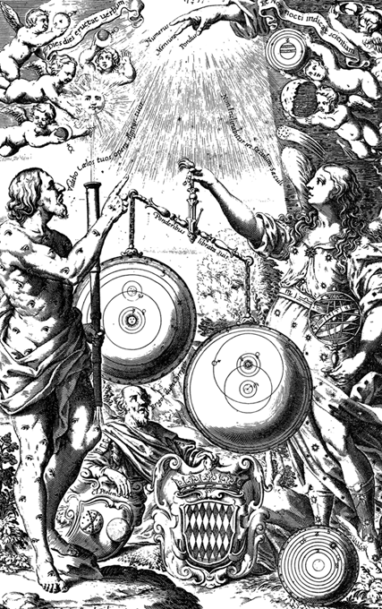 Фронтиспис книги итальянского иезуита Джованни Баттиста Риччоли, где после суда над Галилеем развенчивалась теория Коперника. Астрономия взвешивает модели Коперника и Риччоли и обнаруживает, что модель Риччоли лучше. Именно таким было официальное мнение на момент рождения Ньютона.