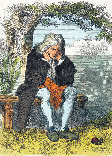 Гравюра, иллюстрирующая легенду о том, как Ньютон открыл всемирное тяготение: когда ему на голову упало яблоко.