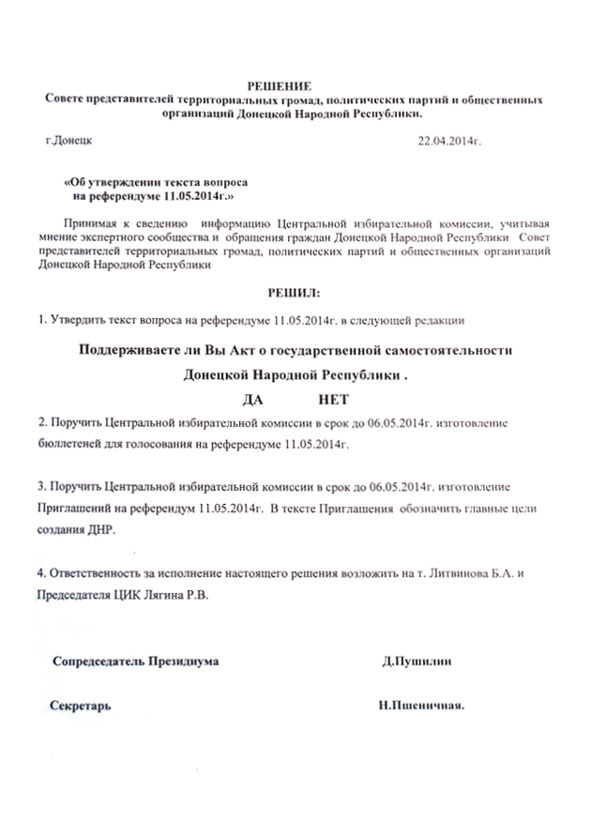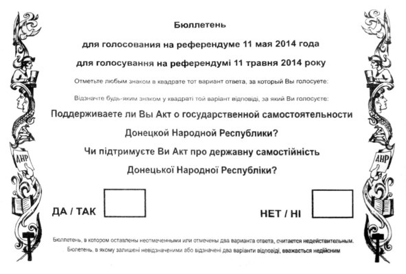11 мая состоялся референдум. Запомнился он многим: это и недостаточное количество избирательных участков (в Мариуполе, к примеру, вместо необходимых 100 участков действовало лишь 4, а на весь Амвросиевский район действовал лишь один участок в г. Амвросиевка), и очереди, вызванные этим недостатком. Организован этот «референдум» был самым примитивным образом: бюллетени печатались на обычном принтере и не имели никаких уровней защиты. «Мы печатали бюллетени на бумаге, которую брали в подвале Обладминистрации на ризографах, одолженных нами у друзей. У нас не было материальной части. Мы пользовались тем, что нам было в то время доступно», — скажет потом глава ЦИК ДНР Р. Лягин. Всего же на проведение референдума, как скажут потом его организаторы, было потрачено в общей сложности не больше двух тысяч долларов. Все это говорит о том, что со стороны России или же отдельных российских политиков на данный референдум не было выделено ни копейки.
