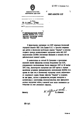 Благодаря хлопотам высокопоставленного болельщика Черненко, он, будучи на службе в гражданской организации, стал полковником, а затем, когда настал необходимый момент времени, ему была надлежащим образом оформлена неплохая военная пенсия…