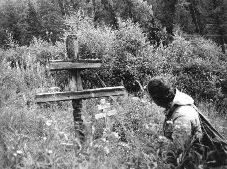 Разожгли костер, готовим обед. Мы с Агашей пошли на верхнюю яму за картошкой. По пути Агаша вновь рассказывает о своей нелегкой жизни. Рассказывая о своих злоключениях за год, Агаша все время подтрунивает над собой и, вероятно, этот юмор ее во многом спасает. Весной повадился к ней ходить медведь. Пришлось несколько раз стрелять из берданке в воздух — отпугивать пришельца. Страшновато, видно, ей было одной. «Как темная ночь, так я стреляю!» — подтрунивает над собой Агафья. Для отпугивания медведя она соорудила «пужало» из красного платья, набив его соломой и водрузив на полку возле избы. Такое же пугало она сделала у могилы отца, которая находится в 35–40 метрах от избы на северо-восток. Тело Карпа Иосифовича обложили плахами, копали могилу не глубоко (земля промерзшая, а отогревать костром по их верованию нельзя), вероятно, поэтому трупный запах привлекал медведя и он пытался разрыть могилу. Помогло ружье, а теперь охраняет покой Карпа Иосифовича красное пужало. В этом месте водятся змеи, одна даже к окошку подползала.