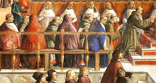 Гонорий III утверждает монашеский устав св. Франциска Ассизского. Доменико Гирландайо, ок. 1485 г., фреска из церкви Святой Троицы во Флоренции. Внизу дети Лоренцо Великолепного