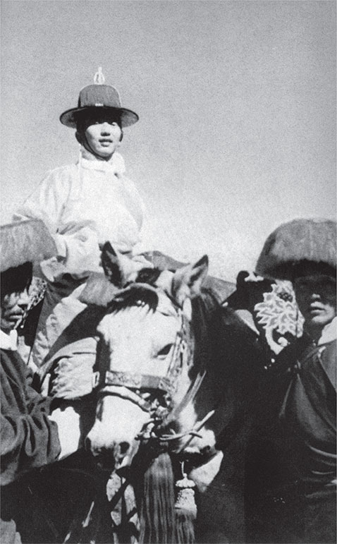 Вскоре мимо нас стали проносить в клетках любимых птиц Божественного Правителя. Время от времени попугай выкрикивал тибетские приветствия, и верующие встречали их восторженными вздохами, будто это были слова самого божества. За слугами на некотором отдалении следовали монахи, несшие флаги с религиозными надписями, дальше ехали верхом облаченные в яркие традиционные одежды музыканты со старинными инструментами. Они издавали странные ноющие звуки, а барабаны громыхали не совсем согласованно, но вместе все это получалось громко и выглядело очень торжественно. За оркестром двигались цедруны, тоже верхом и в порядке, строго соответствующем их рангу. За ними слуги вели пышно украшенных любимых коней Далай-ламы. Сбруя у них желтая, а все металлические ее детали и седла – из чистого золота. В качестве попон используют тяжелую русскую парчу. Лошади, будто сознавая свою ценность, грациозно и своенравно пританцовывали перед застывшей в молчаливом восторге толпой.