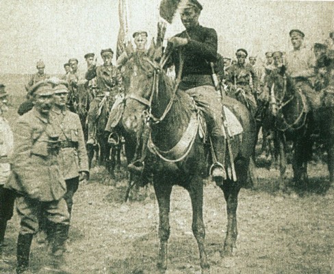 17. Вручение знамени Первой конной армии. Слева — командиры Первой конной Семен Буденный и Климент Ворошилов. 1919
