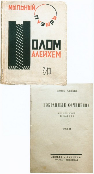 31. Обложка и оборот авантитула книги Шолом-Алейхема «Избранные сочинения. Т. 2. Мыльный пузырь»: М.-Л.: Земля и фабрика, 1927 (перевод с еврейского С. Гехта под редакцией И. Бабеля); полоса в сборнике «Мыльный пузырь» с рекламой 1-го тома «Избранных сочинений» Шолом-Алейхема под редакцией И. Бабеля