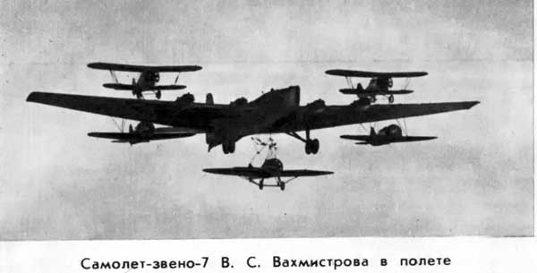 Владимир Сергеевич вновь сел за расчеты. Глубоко убежденный в правильности избранного им пути, он верил, что новая авиационная техника позволит еще больше увеличить радиус полета истребителей. Творческие поиски позволили конструктору объединить вместе четыре самолета. На бомбардировщик ТБ-3 установили три истребителя И-5: по одному на плоскостях и один на фюзеляже. Громадина получилась невиданная, но летала она здорово.