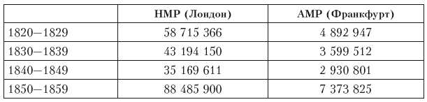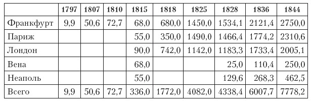 Примечания: итог 1815 г., возможно, был слишком низким; по договору неясно, составлял ли он 500 тысяч или 336 тысяч ф. ст. Следует отметить также, что в 1815 г. приводятся цифры личных долей, а не долей, ассигнованных отдельным домам. Цифра за 1807 г. дана в пересчете с гульденов в фунты стерлингов по курсу 1 фунт = 10,16 гульдена. Цифра за 1828 г. дана в пересчете с гульденов по курсу 1 фунт =12 гульденов.