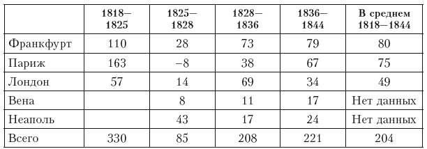 На ил. 10.6 приведены «итоговые» данные за период вплоть до 1850 г.: ежегодные прибыли в процентах от капитала на начало года. Цифры выдают ряд важных сведений: во-первых, сильные колебания результативности; она варьируется от весьма успешной (1834), когда прибыли приближались к четверти капитала, до совершенно катастрофичной (1847), когда компания лишилась почти трети капитала. В среднем прибыли на самом деле оставались довольно непримечательными, хотя это отчасти отражает тот факт, что все расходы вычитались до подсчета чистой прибыли, а не выплачивались из прибыли. Цифры прибылей (или убытков) просто прибавлялись к прошлогоднему капиталу (или вычитались из него); такая система совершенно не похожа на ту, что применялась Бэрингами, одними из главных конкурентов Ротшильдов. Бэринги стремились подсчитывать валовую прибыль и распределять ее между партнерами. Наверное, самое большое различие между Ротшильдами и их конкурентами заключалось в том, что Ротшильды реинвестировали свою чистую прибыль, чтобы их капитал накапливался, в то время как Бэринги сохраняли капитал более или менее постоянным и стремились максимально увеличивать прибыль, на которую они впоследствии могли жить. В 1829–1846 гг., в то время, как капитал фирмы «Н. М. Ротшильд» увеличился на 90 %, капитал братьев Бэринг увеличился всего на 50 %.