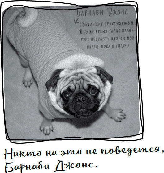 Я с трудом все это печатаю, потому что рука у меня вся распухла, а я всего-то несла своего мопса (по кличке Барнаби Джонс Пиклз) в кровать, когда он внезапно кувыркнулся, чуть не сломав мне средний палец, и пробежал у меня между ног, и я из-за этого так неудачно упала, что так и осталась лежать, не в силах даже пошевелиться. Чтобы стало еще веселее, пес принялся прыгать по моей голове (наверное, чтобы со стороны казалось, будто мы просто играем и он вовсе не пытается меня убить), но меня так просто не одурачить, поэтому я позвала Виктора, который нашел меня у холодильника лежащей на животе. Он был такой весь: