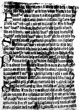 Чаще других встречается 27-строчпый Донат, который считают древнейшим. Он известен ученым по крайней мере в 14 изданиях. Самое старое из них было найдено в Дармштадтской библиотеке Адольфом Шмидтом[241]. Исследователь извлек фрагменты листов 6 и 9 из переплета книги, напечатанной в 1489 г. в Базеле. Отметим попутно, что в 27-строчном Донате по подсчетам ученых должно быть чаще всего 14 листов, или 28 страниц. Ёсть, правда, и исключение — 13-листные Донаты, представленные фрагментами берлинской и московской библиотек.