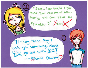 (1) «П-привет. Можно кое-что спросить? Пойдешь со мной на свидание?» – Шейн Доусон (2) «Э-м-м, как бы мне лучше сказать. Ты классный и все такое. Но может, останемся друзьями?..» – Девушка