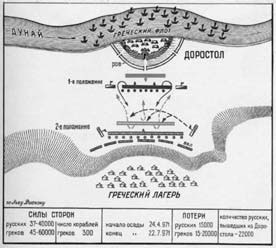 Подойдя к Дунаю, Цимисхий издали увидел мощные укрепления Доростола. Хлебные поля подле города пестрели разноцветными шлемами и знаменами русов. Построившись в ожидании битвы, дружина Свендослава плотно сдвинула щиты и копья, придав своим рядам вид стены. Оглядев многотысячные когорты варваров, Иоанн с улыбкой сказал окружавшим его военачальникам: