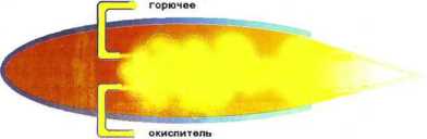 А теперь позволь пригласить тебя к школьной доске. Для начала рисую камеру сгорания. Если в нее подать горючее и окислитель, создать условия, при которых смесь загорится, в камере начнут резко повышаться температура и давление. Из сопла станет вырываться струя горячего газа, и в камере, а точнее в двигателе, возникнет реактивная тяга.
