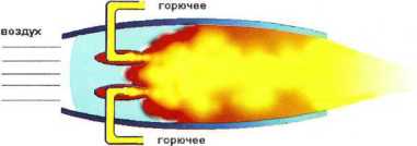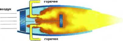 Известно: чтобы сжечь килограмм топлива, надо подать пятнадцать килограммов воздуха. Много? Много! А нельзя ли извлечь кислород из окружающей среды? Берем открытую с двух концов трубу, при движении машины воздух будет засасываться с переднего конца, и в камере сгорания образуется горючая смесь. Рассмотри внимательно рисунок.