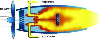Эти двигатели нашли практическое применение во многих странах. Конечно, двигатели выглядят много сложнее, чем на схеме, но суть именно такая: компрессор разгоняет воздух, вращаясь от турбины, сидящей с ним на общей оси… А дальше, ты уже знаешь, поток горячего газа, выходя сквозь сопло, создает необходимую тягу.