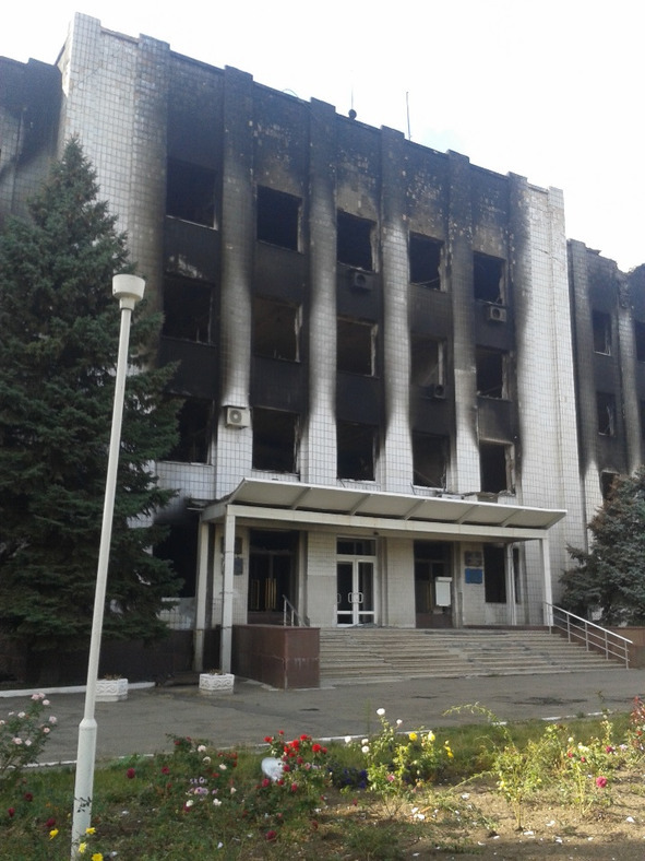 …За время боев город был сильно разрушен. Когда я уже 14 сентября впервые с момента начала боев выбрался в центр города, то увиденное собственными глазами меня шокировало. Некоторые частные дома были уничтожены полностью, 16-этажка сильно повреждена (во время боев горели 3 верхних этажа), почти полностью сгорела одна 9-этажка в центре города (7-й микрорайон), на некоторых других 9-этажках были следы попадания снарядов, во многих домах были выбиты окна. Уничтожено было и здание шахтоуправления (тоже центр города), по которому украинская артиллерия била прямой наводкой. Ранее красивое белое здание теперь, увы, представляет собой лишь обгоревшие стены. Вероятно, артиллеристы ВСУ перепутали это здание с городской администрацией, которая, кстати, находится неподалеку. Сама администрация не пострадала. Сильно было разрушено также здание педагогического училища, верхние этажи которого выгорели полностью. В общем, город произвел удручающее впечатление.