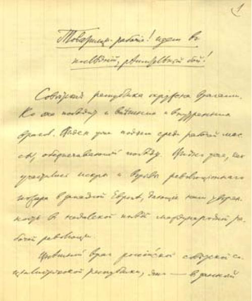 Первая страница рукописи В. И. Ленина «Товарищи-рабочие: идем в последний, решительный бой!». – Первая половина августа 1918 г. (Уменьшено)