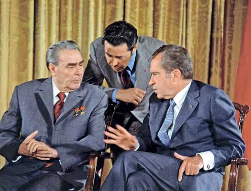 Л. И. Брежнев и Р. Никсон (1973). Между ними – переводчик В. М. Суходрев.