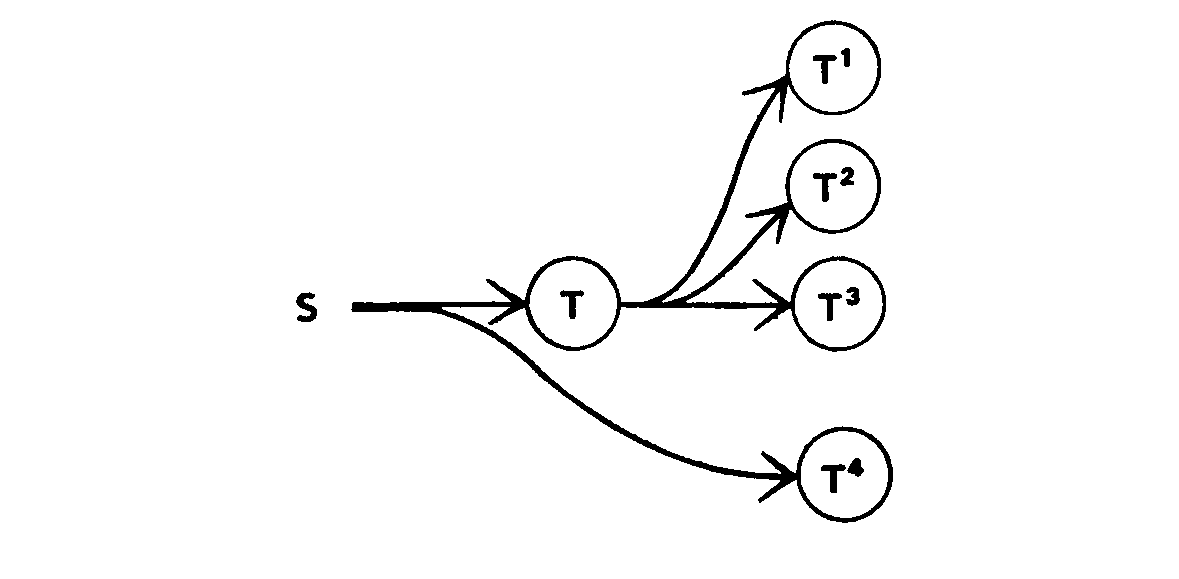 Предположим, что, когда действие стимула впервые подверглось изучению, все первоначальные исследования оказались посвященными его воздействию на Т1 Т2 и Т3. Большие усилия были затрачены на определение того, как именно действует S, и в результате для каждой из трех "мишеней" было с определенностью установлено, что все действия осуществляются через посредство передаточной точки Т. С течением лет способность S воздействовать только через Т приобрела характер классического примера и вошла в учебники. Если теперь обнаружится, что S действует также и на "мишень" Т4, то искушение предположить, что и в этом случае воздействие опосредуется все той же передаточной точкой, будет очень велико. на самом деле S все же может осуществлять свое воздействие напрямую. (как показано на рисунке) или через какую-либо передаточную точку, отличную от Т, но к настоящему времени существует психологический барьер, препятствующий даже рассмотрению такой возможности.