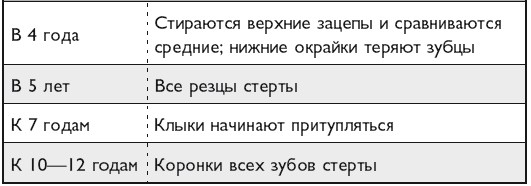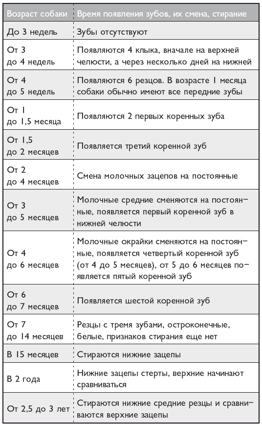 В пятилетнем возрасте собаки все резцы стираются, а к 10–12 годам стираются коронки всех зубов. Стирание зубов, однако, может происходить несколько раньше или позже, в индивидуальном порядке. Более подробные данные изложены в таблице.