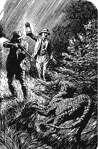 Вечером появились свинцовые тучи, распростершиеся по всему небосклону. Луна должна была подняться не раньше девяти часов; значит, теперь понадобится электрический фонарь; волей-неволей придется зависеть от него. Фонарь был тяжелый и нескладный, а так как Ибботсон настаивал, чтобы стрелял я, мне и пришлось потрудиться, прикрепляя его к штуцеру.