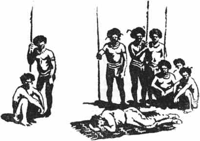 Увидев меня, некоторые туземцы подняли копья, а другие приняли очень воинственную позу, как бы готовясь пустить копье. Несколько восклицаний и коротких фраз с разных концов площадки имели результатом, что копья были опущены.