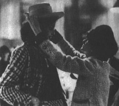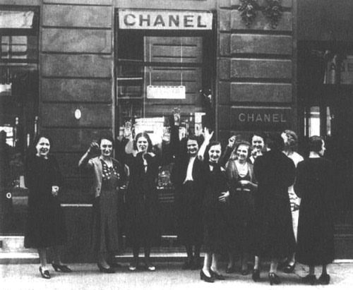 Шанель перед витриной своего первого магазина вместе с «живой рекламой» своих моделей — Адриенной.