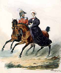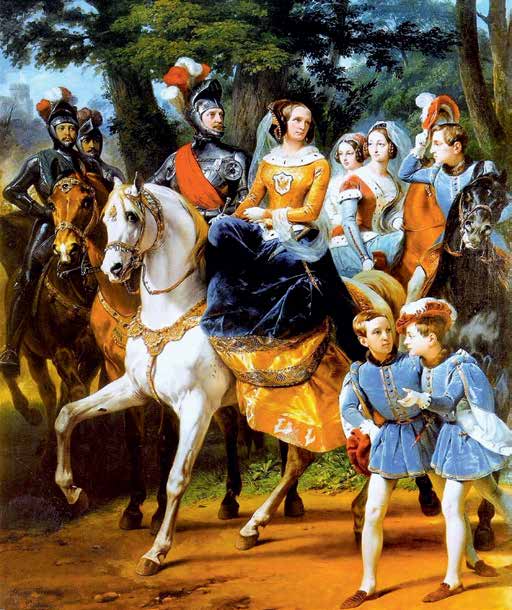 «Царскосельская карусель» 1842 года – портрет семьи Николая I в средневековых костюмах (в день 25-летия его бракосочетания). Слева направо (верхом): Александр Николаевич, герцог Максимилиан Лейхтенбергский (муж Марии Николаевны), Николай I (все трое в настоящих рыцарских доспехах из Арсенала), Александра Фёдоровна, Ольга и Александра Николаевны, Константин Николаевич; внизу справа Николай и Михаил Николаевичи в костюмах пажей. Художник О. Верне.