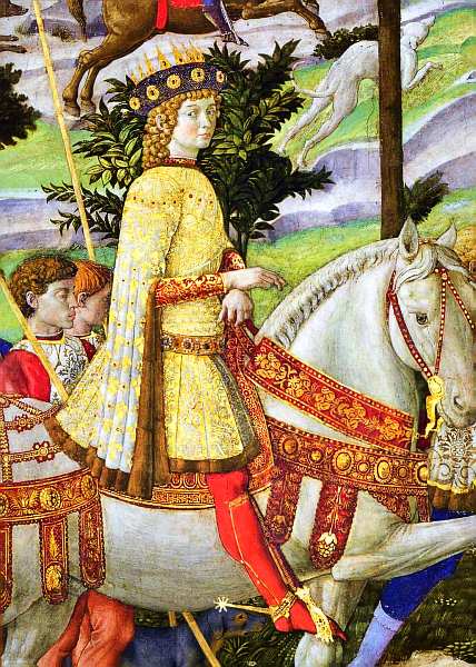 Лоренцо Великолепный в образе одного из царей на фрагменте фрески «Поклонение волхвов» Беноцци Гоццоли в часовне Палаццо Медичи-Риккарди во Флоренции, 1459 г.