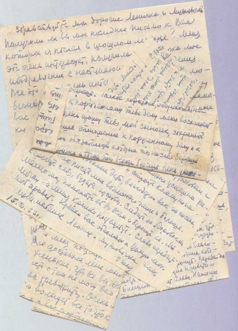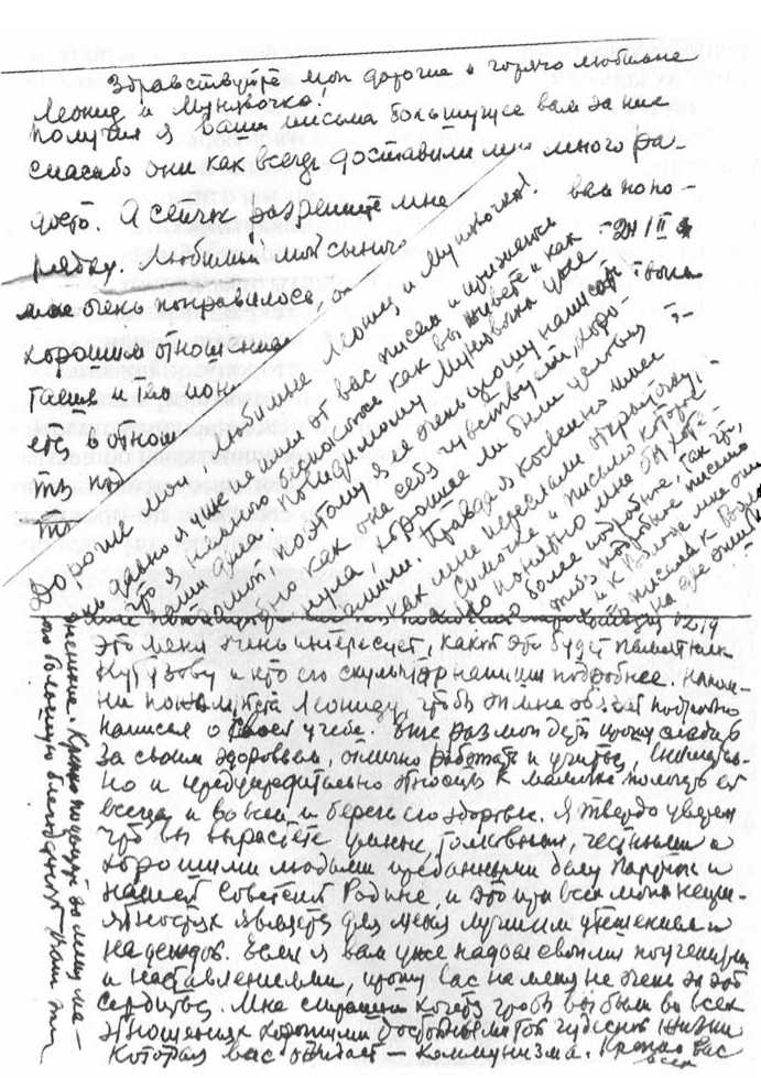 «Любимый мой сыночек! Письмо твоё мне очень понравилось. Особенно я доволен твоим хорошим отношением к коллективу, в котором ты работаешь. И пониманием ответственности, которое у тебя имеется в отношении коллектива, и серьёзности к выполнению обязательств, которые ты на себя берёшь. Такое хорошее, добросовестное отношение к порученному тебе делу меня восхищает и радует. Я очень прошу тебя, мой сыночек, сохранить это хорошее отношение к порученному делу, к выполнению обязательств, которые ты на себя берёшь, всю твою жизнь. Тогда ты всегда будешь очень уважаем людьми, с которыми ты работаешь. А это очень, очень хорошо…»