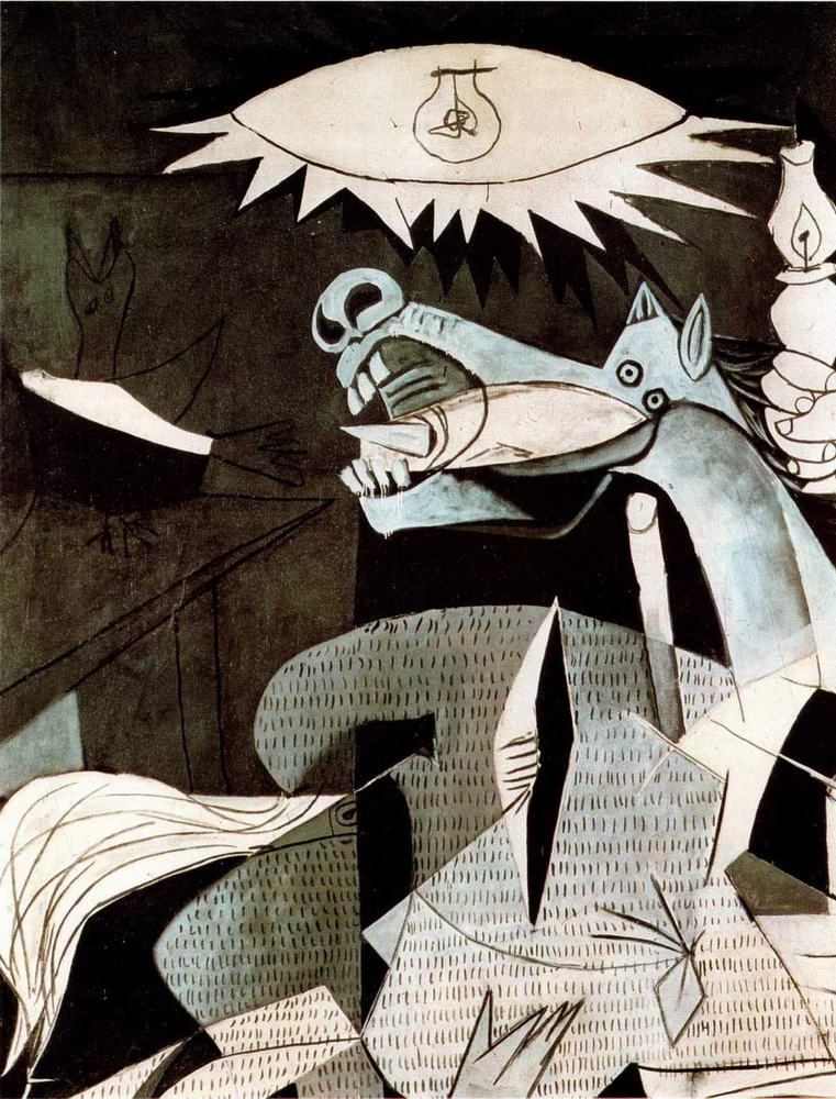 Кроме того, в "Гернике" можно встретить намеки на многие произведения монументальной живописи, относящиеся к эпохе между Темными веками и Возрождением. Похоже, что Пикассо хочет утвердить право собственной живописи на свободное обращение с классикой. И если сам рисунок, наполненный также и цитатами из более ранних произведений самого Пикассо, оживлен этим стремлением высветить и ввести в историю собственно фигуру художника, то решение ограничить цветовую гамму черно-белыми тонами, очевидно, принято с целью напомнить зрителю моментальность фоторепортажей. Пикассо хочет воплотить в "Гернике" образ художника двадцатого века, как в плане его живописи (сочетающей авангардизм и память о традиции), так и в моральном плане (человек, живущий между мифом и реальностью). Картина уже в 1937 году затрагивает вопрос, ставший основным для дискуссий в художественной среде послевоенных лет, - вопрос о том, сможет ли мораль избрать своим рупором авангардизм.