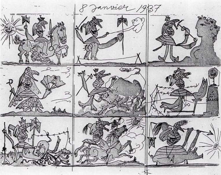 Те же проблемы поднимает серия из восемнадцати гравюр, написанных до и после работы над "Герникой" и предназначенных художником на продажу для финансирования испанского антифашистского движения. "Сны и обманы Франко" I и II сопровождаются факсимиле с несколькими стихотворениями Пикассо (он начал писать стихи в 1935 году).