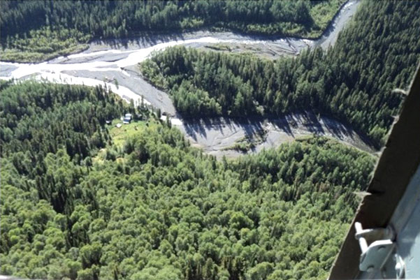 Но вот резко идем вниз в долину Абакана. Уже летим 1 час 5 минут. Скоро Агафьино жилье. Мелькает запущенный, заросший, с частично развалившимися домиками, поселок геологов на реке Каир. Его совсем не узнать, время и тайга делают свое дело быстро. Вот уже и старые избы Лыковых. Идем низко по каньону Абакана между скал. Поворачиваем на запад к Еринату, делаем круг над Агашиным поселением. Садимся на косу. Летели 1 час 14 минут.