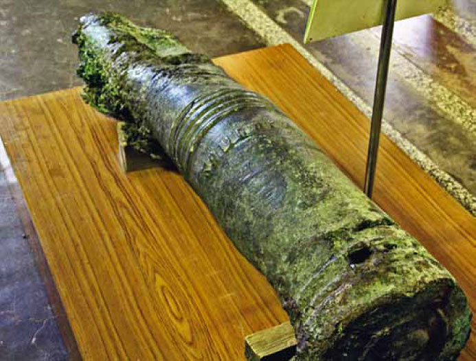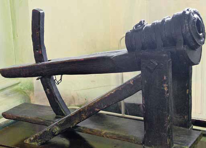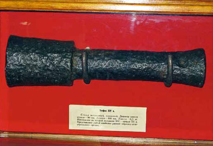 Одним из уникальных образцов подобного вооружения является старейшая из сохранившихся русских пушек, которая ныне является экспонатом краеведческого музея Твери. Эта пушка выкована из одного куска железа. Поскольку изготовлена она в XV веке, у нее нет столь характерных для более позднего времени цапф и дельфинов, а к торели вместо винограда приварено кольцо. Ее калибр составляет 140 мм, а длина ствола – 4100 мм. Короткий ствол и расширение канала ствола от казанной к дульной части может свидетельствовать, что перед нами один из ранних образцов мортир – орудий, предназначенных для навесной стрельбы.
