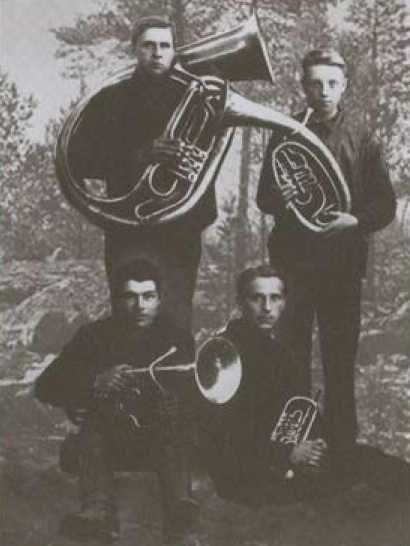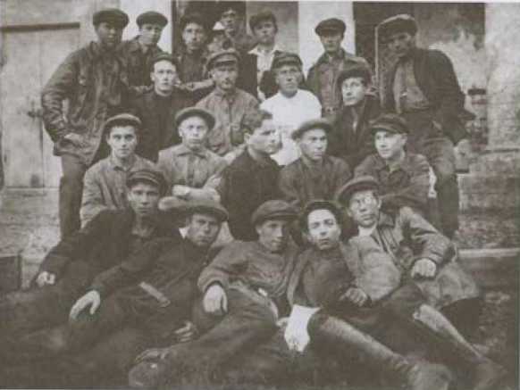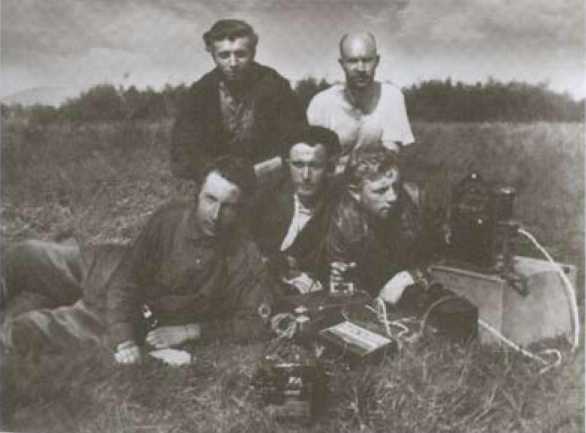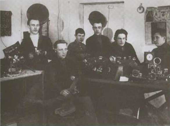 Расплетин (в первом ряду справа) демонстрирует радиопередатчик товарищам по радиокружку.