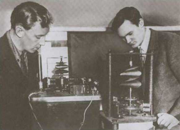 А. А. Расплетин и Г. С. Гурчин у сконструированного ими телевизора с зеркальным винтом.