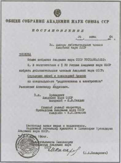 Постановление общего собрания Академии наук СССР об избрании А. А. Расплетина академиком.
